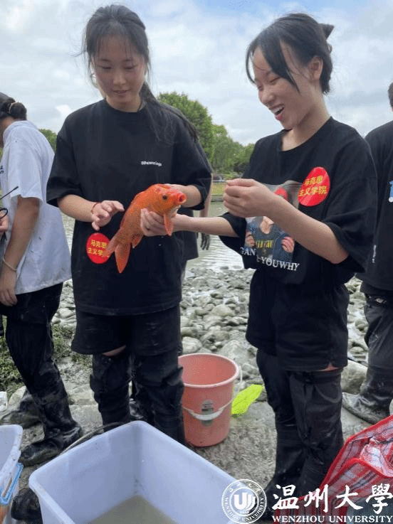 大闸一开,明心湖水缓缓下降,岸边的同学早已穿戴完备,跃跃欲试。随着一声“开鱼咯”,湖面瞬间热闹了起来,草鱼、罗非鱼等纷纷被同学们抓入篓中,岸边的师生也举起手机,记录下这壮观的一幕。