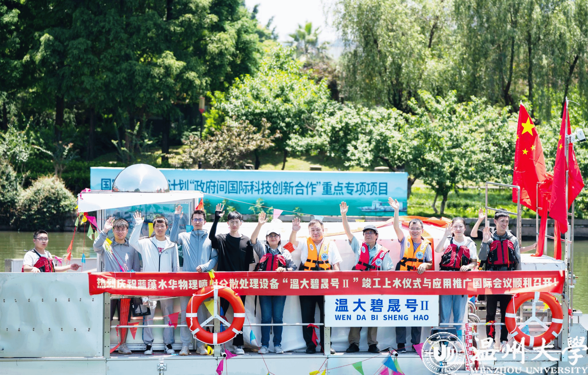 为攻克蓝藻水华治理的世界难题,赵敏&井芹宁团队研发了首台适用于我国大型湖库蓝藻水华暴发特点的处理装备“温大碧晟号I”,使其蓝藻水华处理能力提升5倍以上。在此基础上研发的“温大碧晟号II”,广泛应用于杭州亚运会龙舟赛等国际重大水上赛事水质保障工作。
