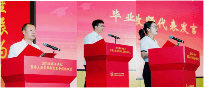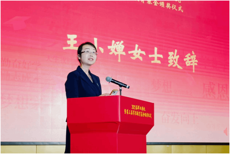 89级校友王小婵女士作为翠琴教育基金捐赠者代表致辞。她祝贺教育基金获得者,感谢母校温馨的氛围给予学生成长道路上的支持。她强调爱的薪火相传让每个人获得奋斗力量,祝愿毕业生们能够以更加自信的面貌开启人生新篇章。随后,举行翠琴教育基金颁奖仪式,表彰了在升学深造、科技创新、学生工作等领域表现突出的学子以及在升学率、优良学风方面表现优异的班集体,王小婵女士与学院班子成员共同为获奖个人、班级代表颁奖。