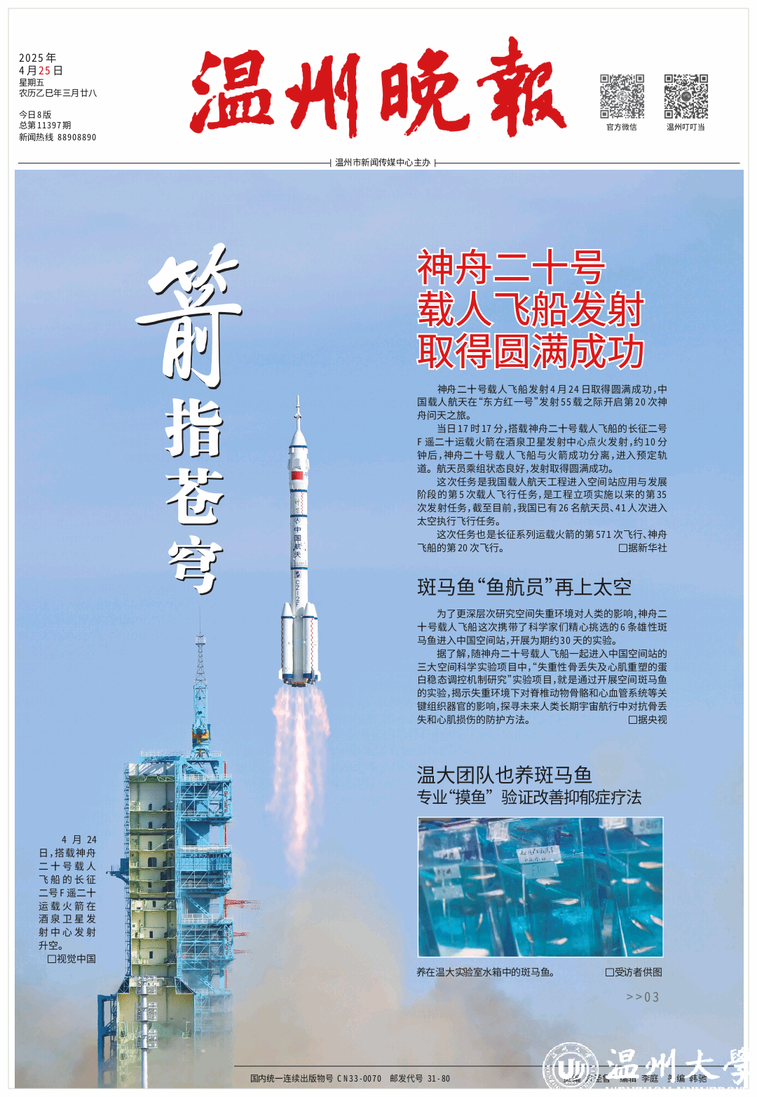 4月24日17时17分,神舟二十号载人飞船在第十个“中国航天日”领命出征,载着斑马鱼、涡虫和链霉菌驶向太空。在温大太阳成集团122cc生研院,斑马鱼生物医学研究团队致力斑马鱼资源开发与生物医学检测技术研发多年,看着自己的“实验伙伴”斑马鱼再次成为“太空明星”,团队人员欣喜非常。“最好的实验伙伴”在神舟二十号载人飞行任务新闻发布会上,中国载人航天工程新闻发言人、中国载人航天工程办公室副主任林西强介绍神舟二十号任务将以斑马鱼、...