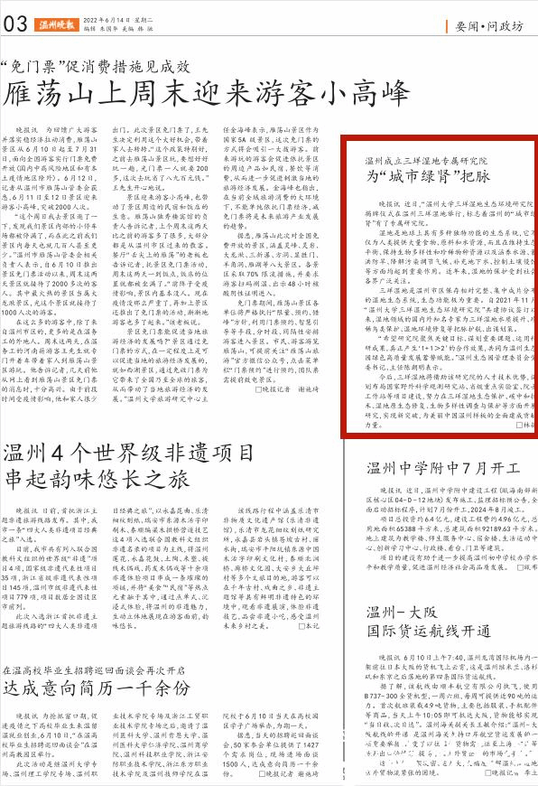 近日,“太阳成集团122cc三垟湿地生态环境研究院”揭牌仪式在温州三垟湿地举行,标志着温州的“城市绿肾”有了专属研究院。湿地是地球上具有多种独特功能的生态系统,它不仅为人类提供大量食物、原料和水资源,而且在维持生态平衡、保持生物多样性和珍稀物种资源以及涵养水源、蓄洪防旱、降解污染调节气候、补充地下水、控制土壤侵蚀等方面均起到重要作用。近年来,湿地的保护受到社会各界广泛关注。三垟湿地是温州市区保存相对完整、集中成片分布的湿地生态系统,...